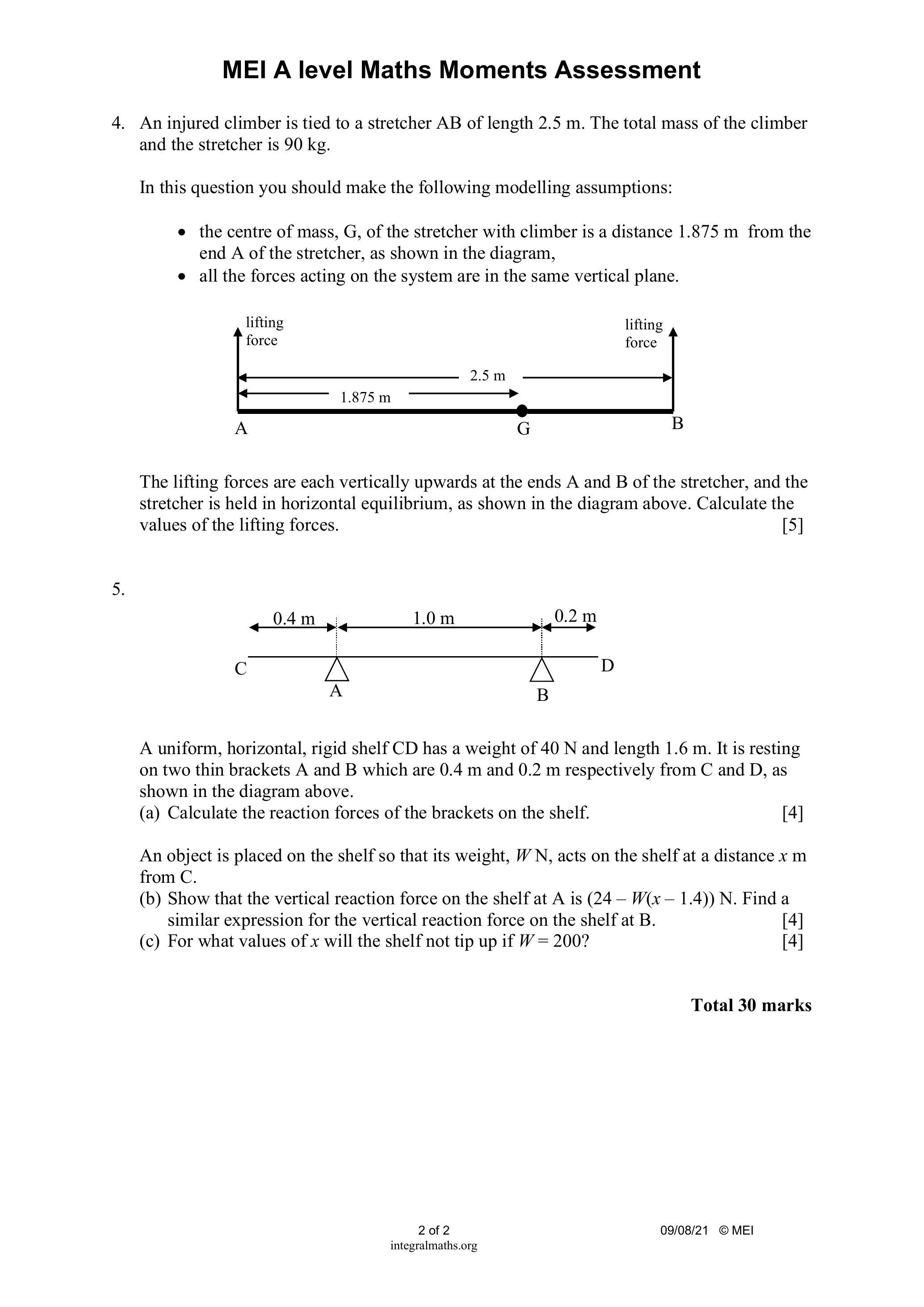 • the centre of mass, G , of the stretcher with climber is a distance 1.875 m from the end A of the stretcher, as shown in the diagram,